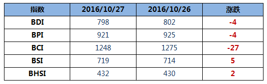 國(guó)際船舶網(wǎng)10月27日消息,波羅的海干散貨運(yùn)價(jià)指數(shù)(BDI)周四下降4點(diǎn),或環(huán)比下降0.50%,為798點(diǎn)。波羅的海好望角型散貨船運(yùn)價(jià)指數(shù)(BCI)下降27點(diǎn),或環(huán)比下降2.12%,至1248點(diǎn)。波羅的海巴拿馬型散貨船運(yùn)價(jià)指數(shù)(BPI)下降4點(diǎn),或環(huán)比下降0.43%,為921點(diǎn)。波羅的海超靈便型散貨船運(yùn)價(jià)指數(shù)(BSI)上升5點(diǎn),或環(huán)比上升0.70%,至719點(diǎn)。波羅的海靈便型散貨船運(yùn)價(jià)指數(shù)(BHSI)上升2點(diǎn),或環(huán)比上升0.47%,至432點(diǎn)。