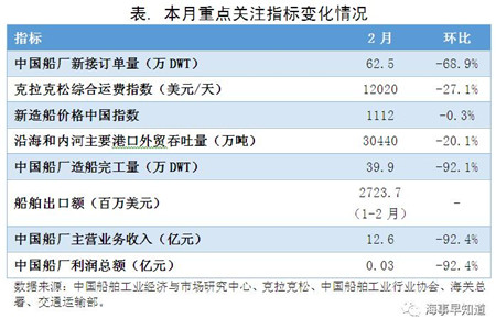 從重點監(jiān)測指標看,2020年2月,中國造船業(yè)景氣先行指數(shù)主要分項指標均下降,其中,中國船廠承接新船訂單62.5萬載重噸,環(huán)比下降68.9%;克拉克松海運指數(shù)平均值12020美元/天,環(huán)比下降27.1%;新造船價格中國指數(shù)1112點,環(huán)比下降0.3%;沿海和內河主要港口外貿吞吐量30440萬噸,環(huán)比下降20.1%。中國造船業(yè)景氣同步指數(shù)重點分項指標均下降,其中,中國造船完工量39.9萬載重噸,環(huán)比下降92.1%;中國船廠主營業(yè)務收入12.6億元,環(huán)比下降92.4%;中國船廠利潤總額0.03億元,環(huán)比下降92.4%。
