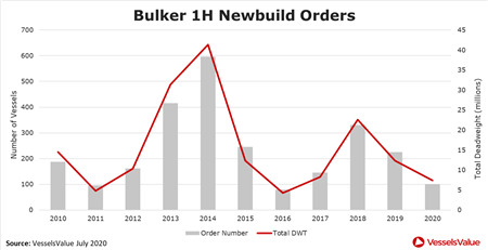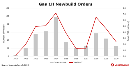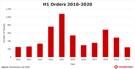 2020 年上半年的新船訂單總量?jī)H 244 艘,與 2019 年相比下降了 50%,處于十年低位。