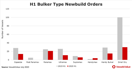 下圖按船型分別比較了 2019 年和 2020 年的上半年訂購(gòu)的干散貨船數(shù)量。