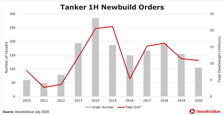 2020 年全球所訂購(gòu)的油輪數(shù)量下降了 32%,但總載重噸僅下降 5%。