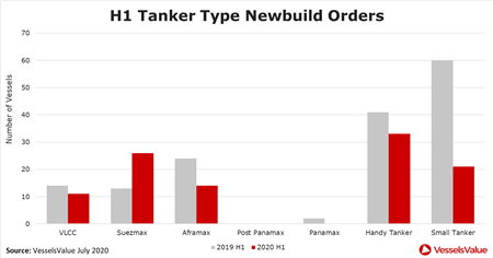 下圖按船型分別比較了 2019 年和 2020 年的上半年訂購(gòu)的油輪數(shù)量。