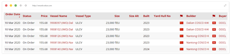 2020 年集裝箱領(lǐng)域的最大訂單是東方海外訂購(gòu)的 5 艘超大型集裝箱船,總價(jià)值 7.784 億美元。