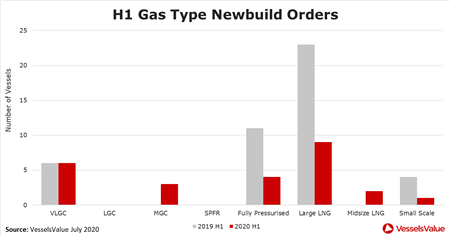 下圖按船型分別比較了 2019 年和 2020 年的上半年訂購(gòu)的液化氣船的數(shù)量。