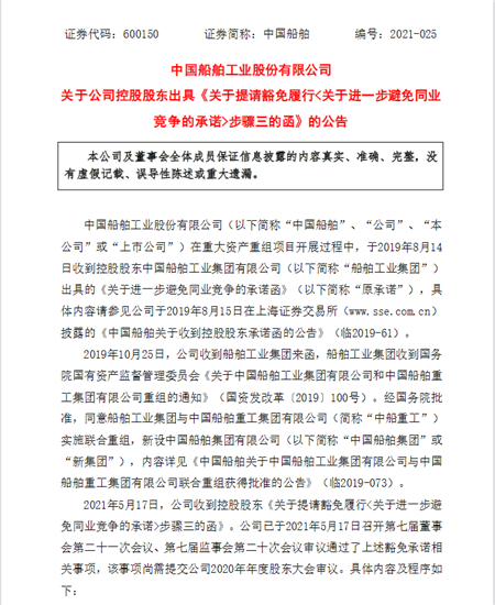 5月18日,中國船舶工業(yè)股份有限公司發(fā)布關(guān)于公司控股股東出具《關(guān)于提請豁免履行<關(guān)于進一步避免同業(yè)競爭的承諾>步驟三的函》的公告,中船海洋與防務(wù)裝備股份有限公司發(fā)布關(guān)于收到控股股東《關(guān)于提請豁免履行<關(guān)于進一步避免同業(yè)競爭的承諾> 步驟三的函》的公告。根據(jù)公告,經(jīng)各方共同努力,原中國船舶工業(yè)集團有限公司和原中國船舶重工集團有限公司聯(lián)合重組涉及的在全球主要國家(地區(qū))的反壟斷審查目前剛剛完成,因此,兩船聯(lián)合重組的內(nèi)外條件均已具備,不確定性因素基本消除,現(xiàn)正抓緊辦理工商變更、產(chǎn)權(quán)登記等法律手續(xù)。