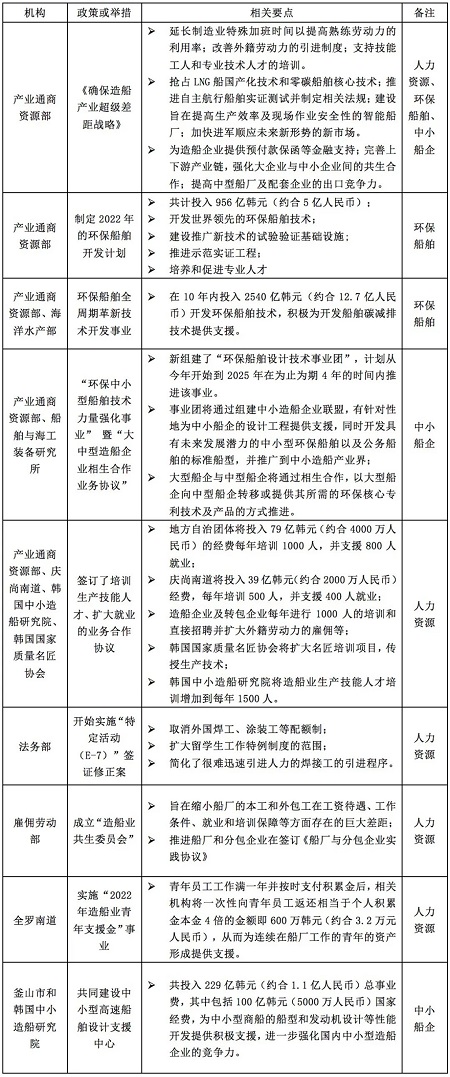 除發(fā)布《確保造船產(chǎn)業(yè)超級(jí)差距戰(zhàn)略》外,其他具體實(shí)施政策主要包括三個(gè)重點(diǎn)方向:一是著重解決人力資源短缺的問(wèn)題;二是加大力度支援環(huán)保船舶的開(kāi)發(fā)與普及;三是對(duì)中小船企提供技術(shù)支持。其中,韓國(guó)司法部實(shí)施新的簽證制度以擴(kuò)大雇傭外國(guó)勞動(dòng)者;產(chǎn)業(yè)通商資源部制定了2022年的環(huán)保船舶開(kāi)發(fā)計(jì)劃,以促進(jìn)系統(tǒng)的環(huán)保船舶開(kāi)發(fā),預(yù)計(jì)共計(jì)投入956億韓元(約合5億人民幣);產(chǎn)業(yè)通商資源部、海洋水產(chǎn)部舉行環(huán)保船舶全周期革新技術(shù)開(kāi)發(fā)事業(yè)綜合事業(yè)團(tuán)啟動(dòng)儀式,將在10年內(nèi)投入2540億韓元(約合12.7億人民幣)開(kāi)發(fā)環(huán)保船舶技術(shù);韓國(guó)產(chǎn)業(yè)通商資源部舉行了“環(huán)保中小型船舶技術(shù)力量強(qiáng)化事業(yè)”簽約儀式。
