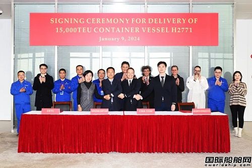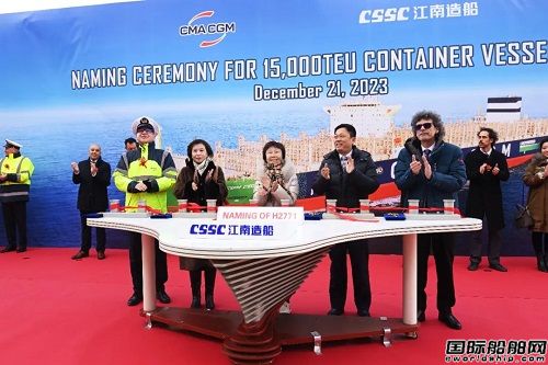 1月9日,中國船舶集團(tuán)旗下江南造船為達(dá)飛海運(yùn)集團(tuán)復(fù)造的首艘15000TEU雙燃料集裝箱船(H2771船)簽字交付。該船于2023年12月21日被命名為“CMA CGM CEDRUS”。