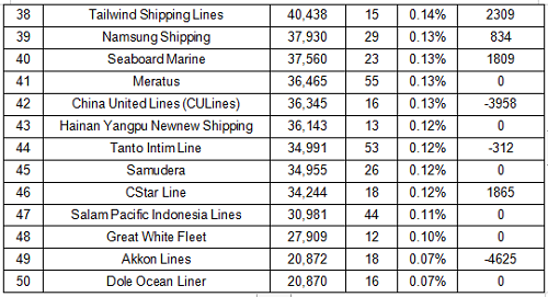 在上榜的中國(guó)內(nèi)地班輪公司中,中遠(yuǎn)海運(yùn)集運(yùn)排名第4位,海豐國(guó)際排名第13位,中谷新良海運(yùn)排名第20位,安通控股(泉州安盛船務(wù))排名第22位,寧波遠(yuǎn)洋排名第25位,中外運(yùn)集運(yùn)排名第32位,上海錦江航運(yùn)排名第33位,唐山港合德海運(yùn)排名第34位,中聯(lián)航運(yùn)排名第42位,洋浦鑫遠(yuǎn)船務(wù)排名第43位,太倉(cāng)港集裝箱海運(yùn)排名第57位,海安新港港務(wù)排名第80位,大連集發(fā)環(huán)渤海集運(yùn)排名第82位,天津達(dá)通航運(yùn)排名第90位,廣西鴻翔船務(wù)排名第95位。