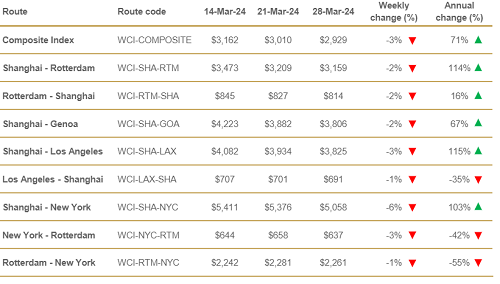 Drewry世界集裝箱指數(shù)WCI,于本周(截至3月28日)下跌3%至2,929美元/FEU,較2022年同期上漲71%,比2019年(疫情前)1,420美元/FEU的平均水平高106%。