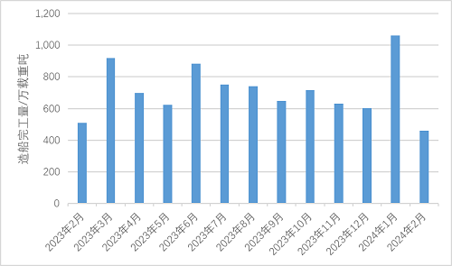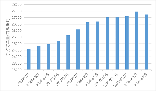 2月,全球成交新船訂單111艘1096萬載重噸,同比分別上漲79.0%和137.7%,環(huán)比分別下降15.9%和上漲34.5%。全球船舶完工交付79艘459萬載重噸,同比分別下降18.6%和9.8%。2月末,全球船舶手持訂單4594艘2.72億載重噸,同比分別上漲2.2%和10.6%。