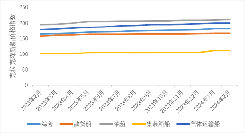 截至2024年2月,克拉克森新船價格指數(shù)收于181點,環(huán)比上漲0.1%,同比上漲10.7%。從主力船型看,散貨船、油船、集裝箱船和氣體運輸船的克拉克森新船價格指數(shù)分別為166點、211點、112點和200點;總體來看,散貨船、集裝箱船和氣體運輸船價格基本保持穩(wěn)定,油船價格上漲相對明顯,漲幅為0.7%;所有船型均實現(xiàn)同比上漲,散貨船、油船、集裝箱船和氣體運輸船的新船價格漲幅分別為5.5%、8.2%、10.2%和12.2%。從典型船型看,17.4萬立方米LNG運輸船和VLCC新船價格保持穩(wěn)定,分別為2.65億美元和1.28億美元,2.3萬TEU箱船新船價格上漲,達到2.645億美元。