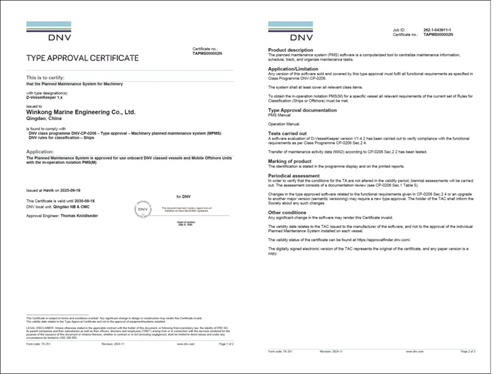 Recently, the D-VesselKeeper Ship Management Platform, independently developed by Winkong Marine Engineering Co., Ltd., has once again achieved a significant milestone. Following its receipt of China Classification Society (CCS) Type Approval Certificate for Ship Machinery Planned Maintenance System (Software) and ClassNK Innovation Endorsement Certificate, it has now officially obtained the DNV Type Approval Certificate for Planned Maintenance System (PMS).