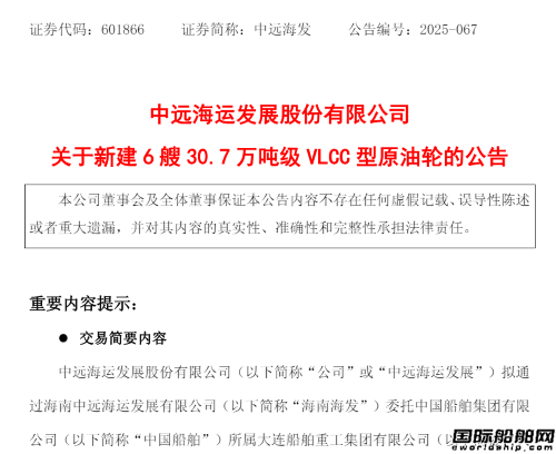 同日,中遠(yuǎn)海發(fā)還宣布,擬通過海南中遠(yuǎn)海運(yùn)發(fā)展有限公司委托中國船舶集團(tuán)有限公司所屬大連船舶重工集團(tuán)有限公司建造6艘30.7萬噸級VLCC,交易總金額人民幣50.858億元(不含稅),單船船價(jià)為人民幣8.478億元(不含稅)。其中首艘船計(jì)劃于2027年4月份開始交付,后期船舶將陸續(xù)于2028年11月底前完成交付。