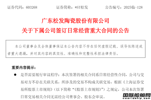 11月27日晚間,廣東松發(fā)陶瓷股份有限公司發(fā)布公告稱,下屬公司恒力造船(大連)有限公司一批船舶建造合同簽約生效,簽約對方為EPS旗下單船公司,合同標的包括6艘30.6萬噸超大型原油運輸船(VLCC)、2艘15.7萬載重噸LNG雙燃料原油船和4艘6000TEU集裝箱船,將在2027年下半年至2028年相繼交付。本次標的合同金額合計約11-16億美元(約合人民幣77.88-113.29億元)。