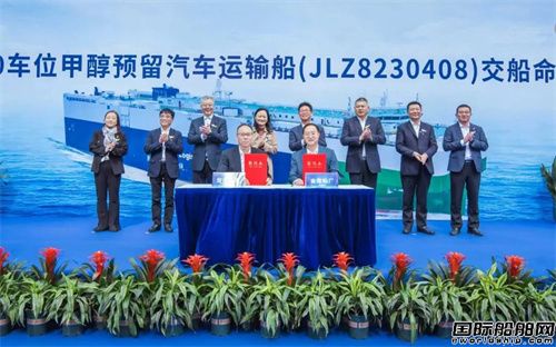 在各方領(lǐng)導(dǎo)的共同見證下,安吉物流副總經(jīng)理忻堅敏先生與金陵船廠總經(jīng)理江家忠先生簽署交船協(xié)議。何曉勁女士為新船命名。