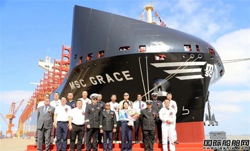 命名人凌曉霞女士將新船命名為“MSC GRACE”輪,為新船砍纜、擲香檳禮、拉響汽笛,并與船長(zhǎng)共同在新船畫(huà)框上署名留念,祝福隨船船員航行平安,為船東和租家?guī)?lái)榮譽(yù)和財(cái)富。