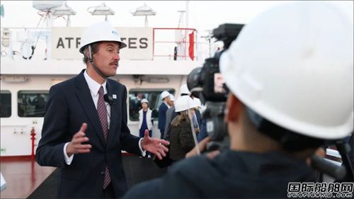 儀式現(xiàn)場,CMB.TECH公司首席執(zhí)行官Alexander Saverys接受采訪,對本次命名的兩艘船給予了高度肯定,并表示,選擇北海造船是非常成功的決定,北海造船的建造效率和品質(zhì)把控都遠(yuǎn)超預(yù)期,對后續(xù)雙方進(jìn)一步擴(kuò)大合作充滿信心。