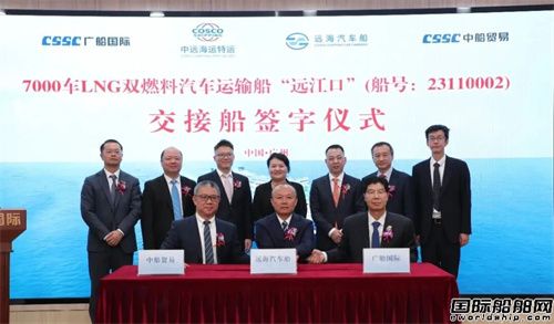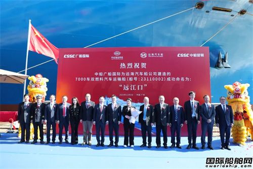 11月5日,廣船國(guó)際聯(lián)合中船貿(mào)易為廣州遠(yuǎn)海汽車運(yùn)輸有限公司建造的7000車LNG雙燃料汽車運(yùn)輸船2號(hào)船“遠(yuǎn)江口”號(hào)在廣州南沙命名交付首航。同日,廣船國(guó)際為J.P.Morgan Asset Management公司建造的4.95萬(wàn)噸甲醇雙燃料油輪3號(hào)船簽字交船。