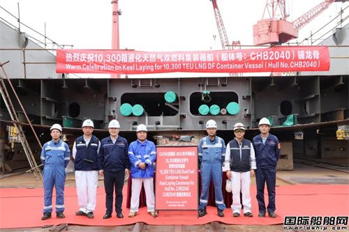 11月12日8時(shí)58分,10300TEU雙燃料LNG動(dòng)力集裝箱船系列第4艘CHB2040船在1號(hào)船臺(tái)完成鋪龍骨儀式。MSC現(xiàn)場(chǎng)經(jīng)理Jihun Jung先生、DNV船級(jí)社代表KB Kim先生及長(zhǎng)宏國(guó)際副總經(jīng)理汪家政先生共同簽署節(jié)點(diǎn)文件。