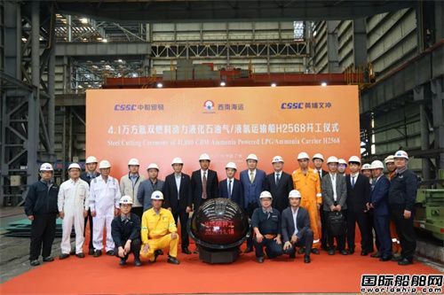 11月18日,中船黃埔文沖船舶有限公司攜手天津西南海運有限公司、勞氏船級社等相關單位,舉行國內(nèi)首制41000方氨雙燃料LPG/液氨運輸船(H2568)開工儀式。