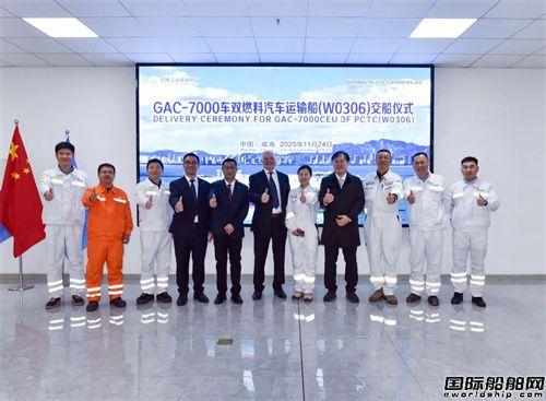 11月24日,招商工業(yè)威海船廠為GAC船東建造的首艘7000車雙燃料汽車運輸船“GLOBAL ACONCAGUA”(W0306)完工交付。GAC船東和公司代表分別在交付文件上簽字。
