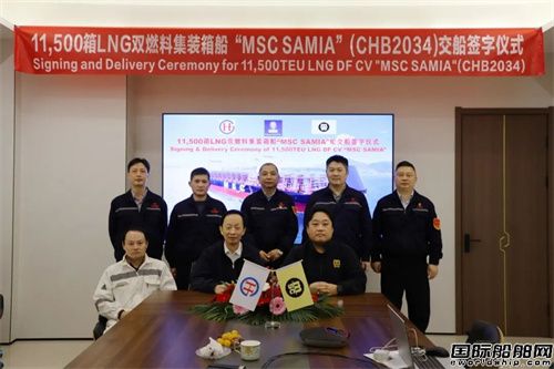 11月24日11時(shí)30分,長(zhǎng)宏國(guó)際為地中海航運(yùn)(MSC)建造的11500TEU雙燃料LNG動(dòng)力集裝箱船“MSC SAMIA”輪(CHB2034)順利命名。