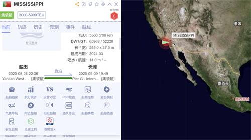 中遠(yuǎn)?破煜麓晫殲楹_\(yùn)圈聚焦提供的數(shù)據(jù)顯示,“MISSISSIPPI”輪船長255米,寬37.3米,載箱量5500TEU,建造時(shí)間為2024年3月,懸掛葡萄牙旗。該船于8月26日從深圳鹽田港出發(fā),于當(dāng)?shù)貢r(shí)間9月9日上午3點(diǎn)左右抵達(dá)美國長灘港。