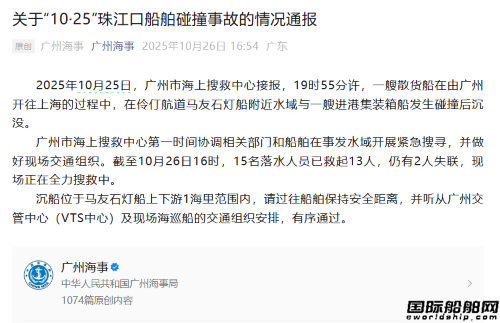 據(jù)廣州海事局通報(bào),10月25日19時(shí)55分許,一艘散貨船在由廣州開往上海的過程中,在伶仃航道馬友石燈船附近水域與一艘進(jìn)港集裝箱船發(fā)生碰撞后沉沒。截至10月26日16時(shí),15名落水人員已救起13人,仍有2人失聯(lián),現(xiàn)場正在全力搜救中。