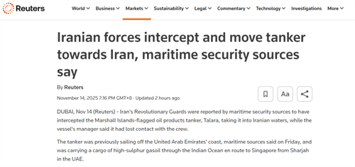 據(jù)路透社消息,11月14日,伊朗海岸警衛(wèi)隊攔截了懸掛馬紹爾群島旗的成品油輪“Talara”輪,并將其帶入伊朗水域。同時,該輪管理方表示,已與船上船員失去聯(lián)系。