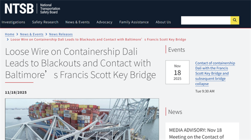 NTSB認(rèn)定事故主要原因是“由接線標(biāo)簽帶安裝不當(dāng)導(dǎo)致的信號(hào)線松動(dòng),使其接觸不良,進(jìn)而導(dǎo)致關(guān)鍵時(shí)刻全船失去電力、推進(jìn)和操舵。”報(bào)告同時(shí)指出,大橋事故之所以造成慘烈后果,是因?yàn)榇髽蛉狈Ψ雷脖Wo(hù)結(jié)構(gòu);若馬里蘭運(yùn)輸管理局(MDTA)按 AASHTO 建議開展脆弱性評(píng)估,本可采取相應(yīng)防護(hù)措施。此外,未能及時(shí)向橋面作業(yè)人員發(fā)出撤離警告,也進(jìn)一步導(dǎo)致人員傷亡。