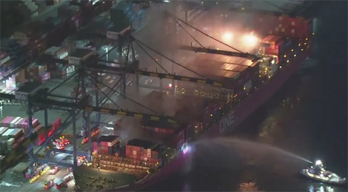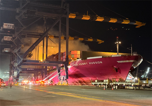事發(fā)后,洛杉磯港表示,包括洛杉磯消防局、長灘消防局、洛杉磯港口警察和美國海岸警衛(wèi)隊正在對“One Henry Hudson”輪甲板下發(fā)生的火災做出響應。已在船只周圍設立水域安全區(qū),并因煙霧和能見度問題封閉了47號州際公路。目前尚未收到人員傷亡報告,所有船員均已撤離。港口的七個集裝箱碼頭中有四個已經(jīng)暫停運營。