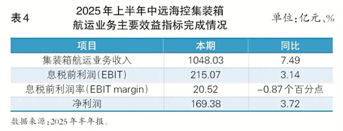 然而,仔細(xì)看收益指標(biāo),貨量與收入的高增未能同步轉(zhuǎn)化為利潤(rùn)。中遠(yuǎn)?丶b箱航運(yùn)的息稅前利潤(rùn)率(EBIT margin)由 21.39%降至20.52%,同比減少0.87個(gè)百分點(diǎn);凈利潤(rùn)169.38億元,增幅3.72%,利潤(rùn)增速明顯落后于收入增速,增收不增利的警報(bào)已經(jīng)拉響。業(yè)內(nèi)人士認(rèn)為,2025 年上半年主干航線競(jìng)爭(zhēng)加劇、成本傳導(dǎo)不暢,集運(yùn)板塊在“量增價(jià)穩(wěn)”的表象下已實(shí)質(zhì)進(jìn)入“利潤(rùn)保衛(wèi)戰(zhàn)”階段(見表4)。