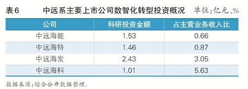 傳統(tǒng)航運(yùn)巨輪正駛?cè)霐?shù)字時(shí)代,中遠(yuǎn)系五家上市公司以同一張“數(shù)智藍(lán)圖”為坐標(biāo),卻用各自不同的技術(shù)路徑和業(yè)務(wù)場(chǎng)景,把“航運(yùn)基因”重塑為“數(shù)據(jù)基因”,聚焦服務(wù)國(guó)家戰(zhàn)略,投入大量研發(fā)資金打造新質(zhì)生產(chǎn)力。本刊通過5家上市公司于今年3月陸續(xù)發(fā)布的《2024年可持續(xù)發(fā)展報(bào)告》發(fā)現(xiàn),除中遠(yuǎn)?匚疵鞔_披露科技研發(fā)金額外,其余4家均有發(fā)布。其中,中遠(yuǎn)海發(fā)投資金額最多,達(dá)2.43億元;但中遠(yuǎn)?仆顿Y金額占主營(yíng)業(yè)務(wù)收入占比最高,達(dá)5.63%(見表6)。