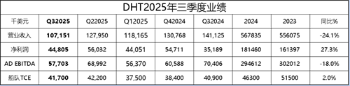 具體而言,2025年三季度,DHT實(shí)現(xiàn)營業(yè)收入1.1億美元,同比減少24.1%;調(diào)整后的息稅折舊攤銷前利潤(EBITDA)為5770.3萬美元,同比減少18.0%;凈利潤為4480.5萬美元或每股0.28美元,同比增長27.3%。