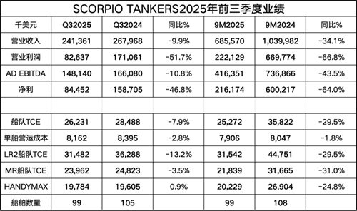 2025年三季度,天蝎座油輪實現(xiàn)營業(yè)收入2.4億美元,同比下降9.9%;營業(yè)利潤達到8263.7萬美元,同比下降51.7%;調整后的息稅折舊攤銷前利潤(EBITDA)達到1.5億美元,同比下降10.8%;凈利潤達到8445.2萬美元,同比下降46.8%,環(huán)比增長14.9%。