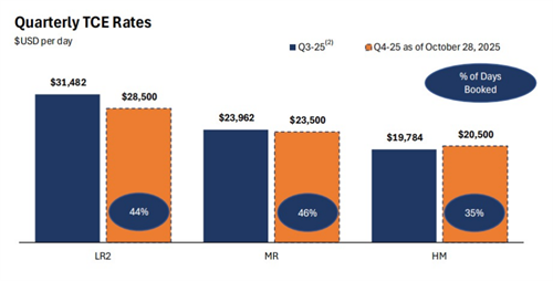 對于2025年四季度,天蝎座油輪預計LR2船隊現(xiàn)貨市場日租金達到28500美元,已經(jīng)鎖定44%的營運日收入;MR船隊現(xiàn)貨市場日租金達到23500美元,已經(jīng)鎖定46%營運日收入;Handymax船隊現(xiàn)貨市場日租金達到20500美元,已鎖定35%營運日收入。