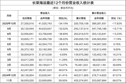 長榮海運(yùn)2025年10月實(shí)現(xiàn)營業(yè)收入新臺幣273.3億元(約8.9億美元),同比下降34.2%,環(huán)比下降9.3%。