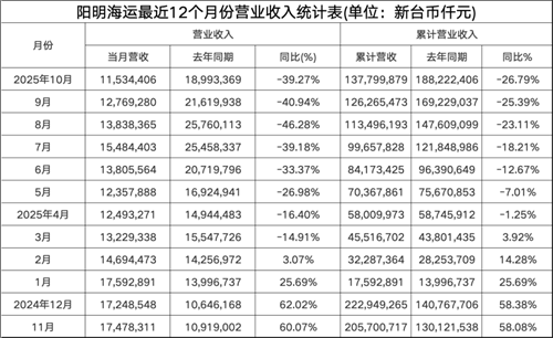 2025年前10個月,陽明海運(yùn)累計實(shí)現(xiàn)營業(yè)收入新臺幣1378.0億元(約44.2億美元),同比減少26.8%。