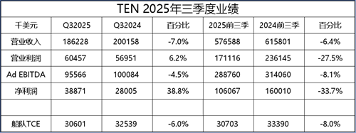 2025年前三季度,TEN實現(xiàn)營業(yè)收入5.8億美元,同比減少6.4%;調(diào)整后EBITDA為2.9億美元,同比減少8.1%;營業(yè)利潤達到1.7億美元,同比減少27.5%;凈利潤為1.1億美元,同比減少33.7%。