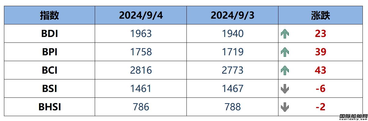 國際船舶網(wǎng)9月4日消息,波羅的海干散貨運(yùn)價指數(shù)(BDI)周四上升23點(diǎn),或環(huán)比上升1.19%至1963點(diǎn)。波羅的海好望角型散貨船運(yùn)價指數(shù)(BCI)上升43點(diǎn),或環(huán)比上升1.55%至2816點(diǎn)。波羅的海巴拿馬型散貨船運(yùn)價指數(shù)(BPI)上升39點(diǎn),或環(huán)比上升2.27%至1758點(diǎn)。波羅的海超靈便型散貨船運(yùn)價指數(shù)(BSI)下降6點(diǎn),或環(huán)比下降0.41%至1461點(diǎn)。波羅的海靈便型散貨船運(yùn)價指數(shù)(BHSI)下降2點(diǎn),或環(huán)比下降0.25%至786點(diǎn)。