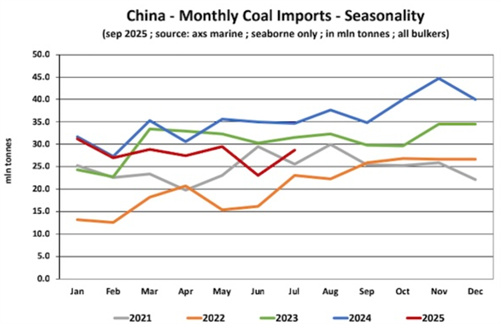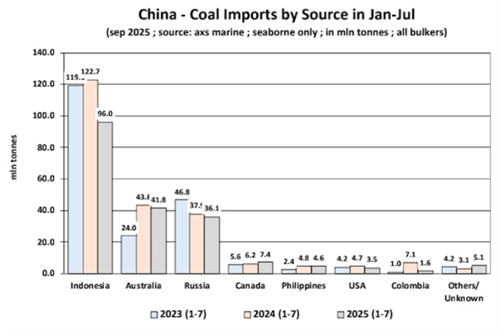 Banchero Costa指出,中國仍是全球最大煤炭進口國(涵蓋動力煤與煉焦煤),2025年占全球海運煤炭市場的26.5%,遠超印度的19.2%和日本的11.5%;仡櫲ツ辏袊旰_\煤炭進口量創(chuàng)下歷史新高,達到4.27億噸,同比增長15.9%,而2023年則已大增48.6%。不過,2025年1-7月進口量盡管出現(xiàn)回落,但仍高于2022年同期的1.20億噸和2021年的1.69億噸。