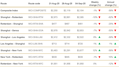 Drewry世界集裝箱運價指數(shù)(WCI)本周(截至9月4日)環(huán)比上周下跌1%,約為2,104美元/FEU。
