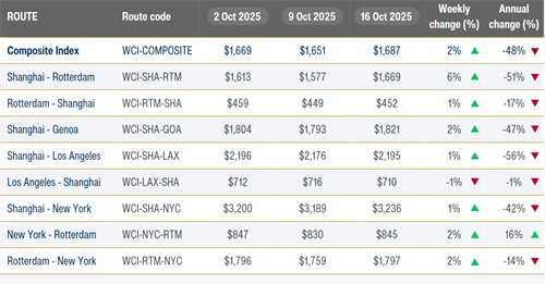 Drewry世界集裝箱運(yùn)價(jià)指數(shù)(WCI)本周(截至10月16日)環(huán)比上周上漲2%,約為1,687美元/FEU。