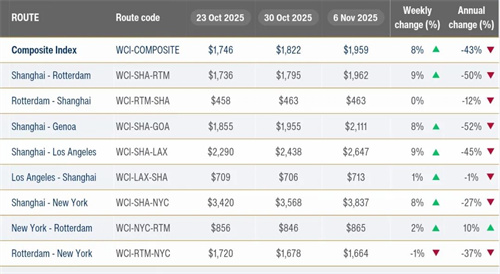 歐洲航線同樣呈現(xiàn)漲勢:上海至鹿特丹運價上漲9%,至1962美元/FEU;上海至熱那亞運價增長8%,至2111美元/FEU。值得關(guān)注的是,亞歐航線的承運商宣布自11月15日起實施新一輪FAK運價,旨在為即將開始的年度合約談判季營造有利的市場環(huán)境。
