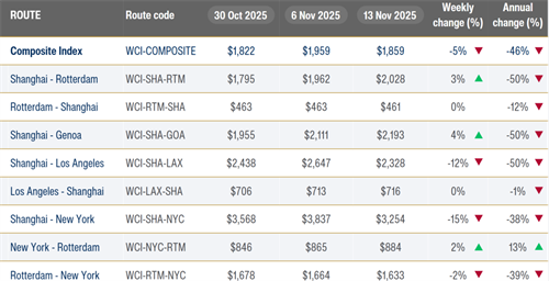 與此相反,上海至歐洲航線的運價則有所回升。上海至熱那亞航線運價上漲4%,至2193美元/FEU;上海至鹿特丹航線運價上升3%,至2028美元/FEU。亞歐航線的船公司正試圖推高現(xiàn)貨市場運價,宣布自11月15日起實施新的均一運費FAK(標(biāo)準(zhǔn)為每40英尺集裝箱3000至3650美元,以期在新一年度合約談判季開始前提振現(xiàn)貨運價水平。