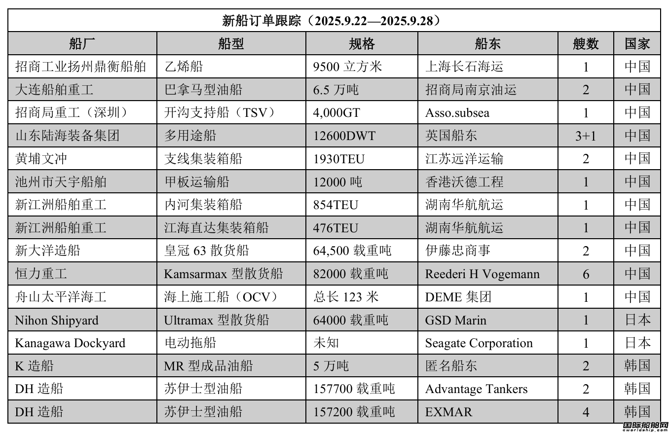 新船訂單跟蹤(2025.9.22—2025.9.28)