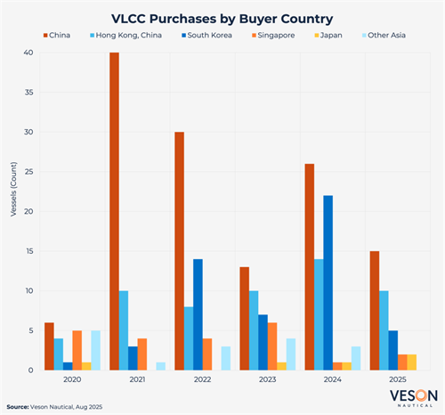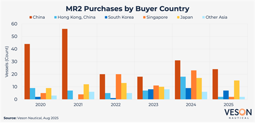 與此同時,亞洲各國船東的策略差異明顯。報告顯示,中國主導了老齡VLCC的收購潮;韓國船東則傾向于“逆周期”收購中齡船舶;而日本船東則幾乎避開老齡VLCC,轉(zhuǎn)向購買更年輕的MR2型成品油輪,以符合更嚴格的融資與監(jiān)管要求。