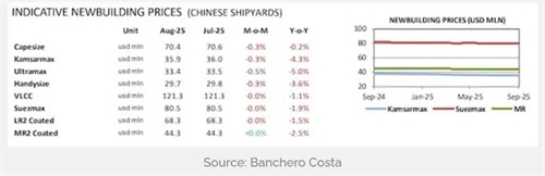 船舶經(jīng)紀(jì)公司Banchero Costa補(bǔ)充指出,卡姆薩爾型散貨船板塊,揚(yáng)子江造船2017年建造的8.2萬噸級(jí)TR LADY輪以2400萬美元的價(jià)格售予希臘買家。巴拿馬型散貨船板塊,常石造船2004年建造的7.6萬噸級(jí)EIRINI P輪以850萬美元成交。超靈便型散貨船板塊,巖城造船2012年建造的6.1萬噸級(jí)EXPLORER EUROPE輪以1830萬美元的價(jià)格售予中國買家。靈便型散貨船板塊,浙江正和造船2010年建造的3.3萬噸級(jí)姐妹船CH BELLA輪與CH DORRIS輪分別以820萬美元的單價(jià)易主。阿芙拉型油輪板塊,外高橋造船2008年建造的10.5萬噸級(jí)OLYMPIC SEA輪及其姐妹船OLYMPIC SKY輪(同廠2008年建)均以2950萬美元的單價(jià)成交。