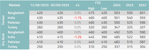 Intermodal總結(jié)稱,“土耳其拆船市場表現(xiàn)平穩(wěn),變化很小。當?shù)劁撹F需求疲軟促使鋼鐵廠縮減產(chǎn)量。與此同時,里拉兌美元繼續(xù)貶值,創(chuàng)下新低,給市場增加了壓力”。