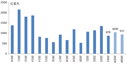 預(yù)計(jì)油價(jià)將繼續(xù)承壓,但對(duì)油氣勘探開發(fā)活動(dòng)仍有支撐。短期內(nèi),全球油氣供給將保持寬松態(tài)勢(shì),國(guó)際油價(jià)走勢(shì)偏弱。根據(jù)全球主要機(jī)構(gòu)預(yù)期,2026年布倫特原油價(jià)格在60美元/桶左右。但是,經(jīng)過油氣行業(yè)十多年的成本壓降,海上油氣開發(fā)項(xiàng)目成本線普遍在30-50美元/桶之間,大多數(shù)油氣項(xiàng)目仍能實(shí)現(xiàn)經(jīng)濟(jì)性開發(fā)。根據(jù)克拉克森預(yù)測(cè),2026年全球海上油氣開發(fā)項(xiàng)目投資將達(dá)到937億美元,保持在歷史較高水平。